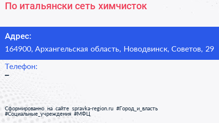 По-итальянски, сеть химчисток по адресу 164900, Архангельская область, Новодвинск, Советов, 29 в дальнейшем Организация, размещена в следующих категориях: