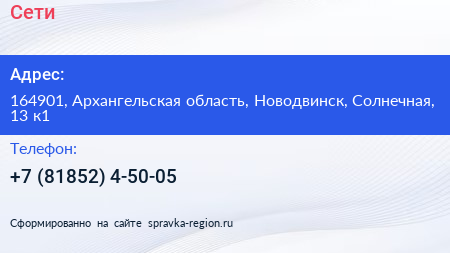 Сети по адресу 164901, Архангельская область, Новодвинск, Солнечная, 13 к1 в дальнейшем Организация, размещена в следующих категориях: