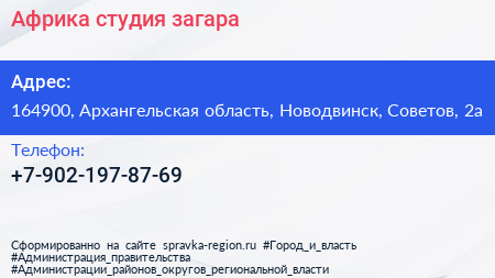 Африка, студия загара по адресу 164900, Архангельская область, Новодвинск, Советов, 2а в дальнейшем Организация, размещена в следующих категориях:
