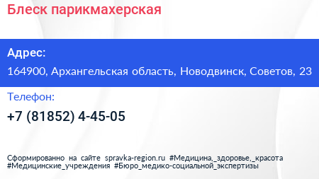 Блеск, парикмахерская по адресу 164900, Архангельская область, Новодвинск, Советов, 23 в дальнейшем Организация, размещена в следующих категориях:
