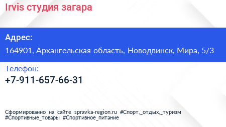 Irvis, студия загара по адресу 164901, Архангельская область, Новодвинск, Мира, 5/3 в дальнейшем Организация, размещена в следующих категориях: