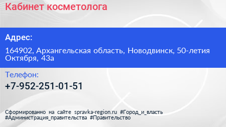 Кабинет косметолога по адресу 164902, Архангельская область, Новодвинск, 50-летия Октября, 43а в дальнейшем Организация, размещена в следующих категориях: