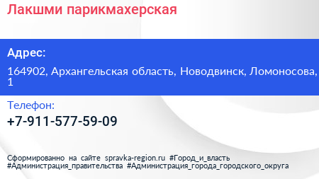 Лакшми, парикмахерская по адресу 164902, Архангельская область, Новодвинск, Ломоносова, 1 в дальнейшем Организация, размещена в следующих категориях:
