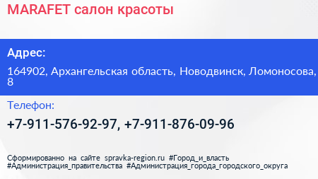 MARAFET, салон красоты по адресу 164902, Архангельская область, Новодвинск, Ломоносова, 8 в дальнейшем Организация, размещена в следующих категориях: