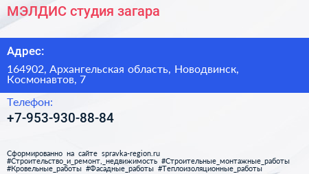 МЭЛДИС, студия загара по адресу 164902, Архангельская область, Новодвинск, Космонавтов, 7 в дальнейшем Организация, размещена в следующих категориях: