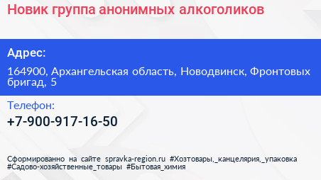 Новик, группа анонимных алкоголиков по адресу 164900, Архангельская область, Новодвинск, Фронтовых бригад, 5 в дальнейшем Организация, размещена в следующих категориях: