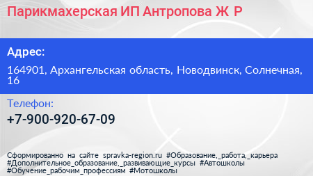 Парикмахерская, ИП Антропова Ж.Р. по адресу 164901, Архангельская область, Новодвинск, Солнечная, 16 в дальнейшем Организация, размещена в следующих категориях: