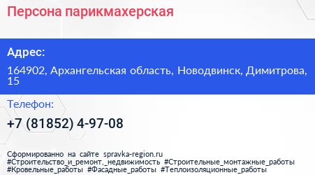 Персона, парикмахерская по адресу 164902, Архангельская область, Новодвинск, Димитрова, 15 в дальнейшем Организация, размещена в следующих категориях: