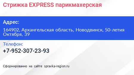 Стрижка EXPRESS, парикмахерская по адресу 164902, Архангельская область, Новодвинск, 50-летия Октября, 39 в дальнейшем Организация, размещена в следующих категориях: