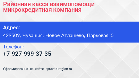 Районная касса взаимопомощи, микрокредитная компания по адресу 429509, Чувашия, Новое Атлашево, Парковая, 5 в дальнейшем Организация, размещена в следующих категориях: