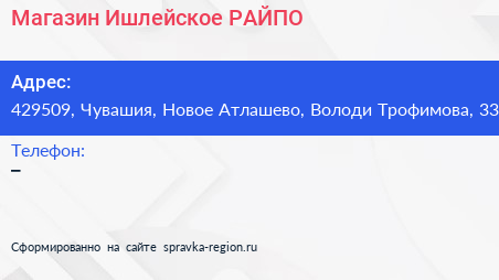 Магазин, Ишлейское РАЙПО по адресу 429509, Чувашия, Новое Атлашево, Володи Трофимова, 33 в дальнейшем Организация, размещена в следующих категориях: