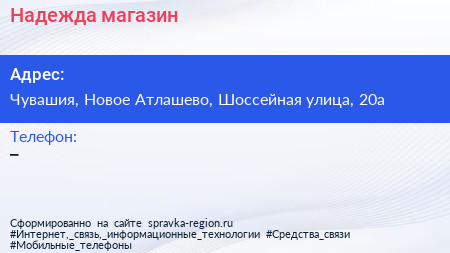 Надежда, магазин по адресу Чувашия, Новое Атлашево, Шоссейная улица, 20а в дальнейшем Организация, размещена в следующих категориях: