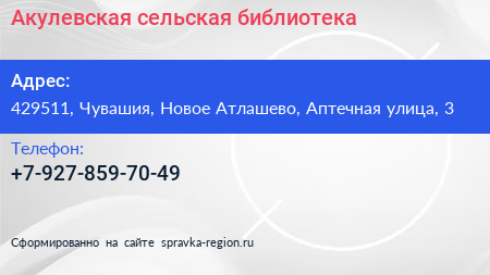 Акулевская сельская библиотека по адресу 429511, Чувашия, Новое Атлашево, Аптечная улица, 3 в дальнейшем Организация, размещена в следующих категориях: