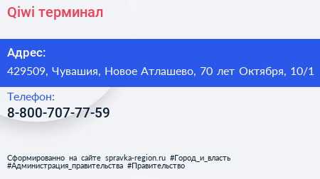 Qiwi, терминал по адресу 429509, Чувашия, Новое Атлашево, 70 лет Октября, 10/1 в дальнейшем Организация, размещена в следующих категориях: