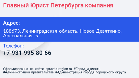 Главный Юрист Петербурга, компания по адресу 188673, Ленинградская область, Новое Девяткино, Арсенальная, 5 в дальнейшем Организация, размещена в следующих категориях:
