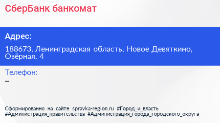 СберБанк, банкомат по адресу 188673, Ленинградская область, Новое Девяткино, Озёрная, 4 в дальнейшем Организация, размещена в следующих категориях: