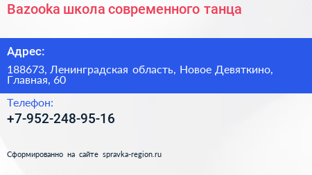 Bazooka, школа современного танца по адресу 188673, Ленинградская область, Новое Девяткино, Главная, 60 в дальнейшем Организация, размещена в следующих категориях:
