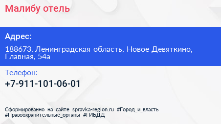 Малибу, отель по адресу 188673, Ленинградская область, Новое Девяткино, Главная, 54а в дальнейшем Организация, размещена в следующих категориях: