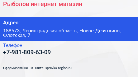 Рыболов, интернет-магазин по адресу 188673, Ленинградская область, Новое Девяткино, Флотская, 7 в дальнейшем Организация, размещена в следующих категориях: