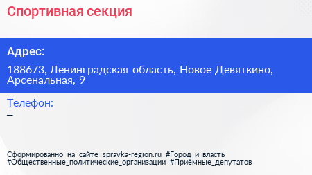 Спортивная секция по адресу 188673, Ленинградская область, Новое Девяткино, Арсенальная, 9 в дальнейшем Организация, размещена в следующих категориях: