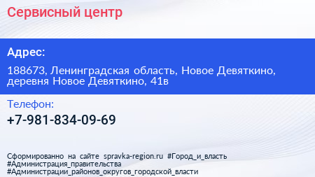 Сервисный центр по адресу 188673, Ленинградская область, Новое Девяткино, деревня Новое Девяткино, 41в в дальнейшем Организация, размещена в следующих категориях: