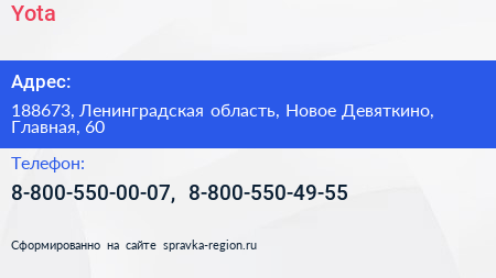 Yota по адресу 188673, Ленинградская область, Новое Девяткино, Главная, 60 в дальнейшем Организация, размещена в следующих категориях: