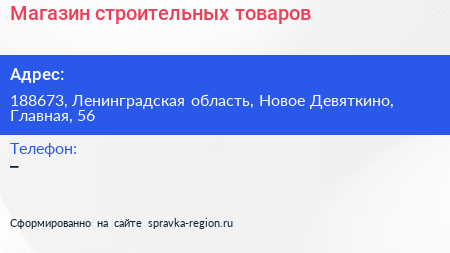 Магазин строительных товаров по адресу 188673, Ленинградская область, Новое Девяткино, Главная, 56 в дальнейшем Организация, размещена в следующих категориях: