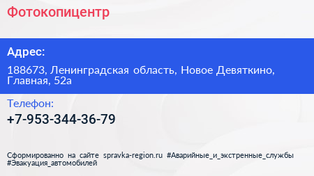 Фотокопицентр по адресу 188673, Ленинградская область, Новое Девяткино, Главная, 52а в дальнейшем Организация, размещена в следующих категориях: