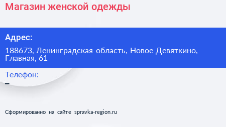 Магазин женской одежды по адресу 188673, Ленинградская область, Новое Девяткино, Главная, 61 в дальнейшем Организация, размещена в следующих категориях: