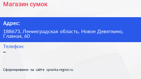 Магазин сумок по адресу 188673, Ленинградская область, Новое Девяткино, Главная, 60 в дальнейшем Организация, размещена в следующих категориях: