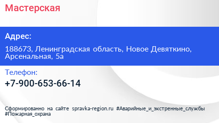 Мастерская по адресу 188673, Ленинградская область, Новое Девяткино, Арсенальная, 5а в дальнейшем Организация, размещена в следующих категориях: