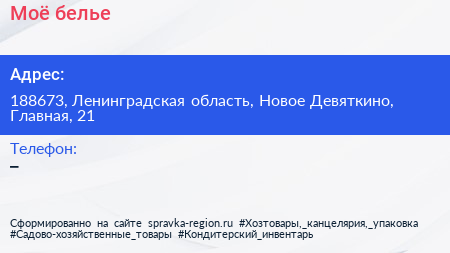 Моё белье по адресу 188673, Ленинградская область, Новое Девяткино, Главная, 21 в дальнейшем Организация, размещена в следующих категориях: