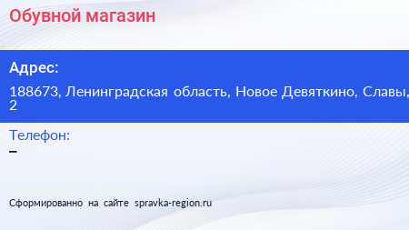 Обувной магазин по адресу 188673, Ленинградская область, Новое Девяткино, Славы, 2 в дальнейшем Организация, размещена в следующих категориях: