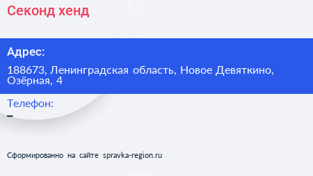 Секонд-хенд по адресу 188673, Ленинградская область, Новое Девяткино, Озёрная, 4 в дальнейшем Организация, размещена в следующих категориях: