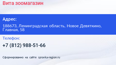 Вита, зоомагазин по адресу 188673, Ленинградская область, Новое Девяткино, Главная, 58 в дальнейшем Организация, размещена в следующих категориях: