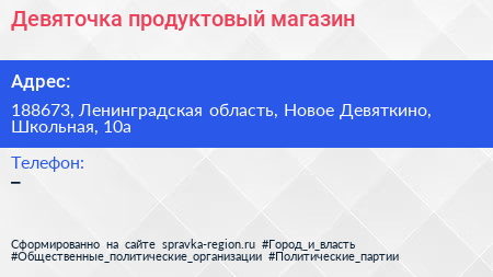 Девяточка, продуктовый магазин по адресу 188673, Ленинградская область, Новое Девяткино, Школьная, 10а в дальнейшем Организация, размещена в следующих категориях:
