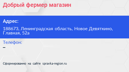 Добрый фермер, магазин по адресу 188673, Ленинградская область, Новое Девяткино, Главная, 52а в дальнейшем Организация, размещена в следующих категориях:
