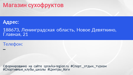 Магазин сухофруктов по адресу 188673, Ленинградская область, Новое Девяткино, Главная, 21 в дальнейшем Организация, размещена в следующих категориях: