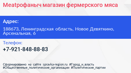 Meatрофаныч, магазин фермерского мяса по адресу 188673, Ленинградская область, Новое Девяткино, Арсенальная, 6 в дальнейшем Организация, размещена в следующих категориях: