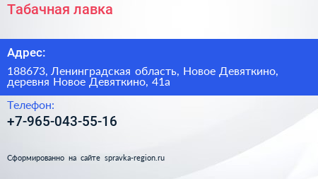 Табачная лавка по адресу 188673, Ленинградская область, Новое Девяткино, деревня Новое Девяткино, 41а в дальнейшем Организация, размещена в следующих категориях: