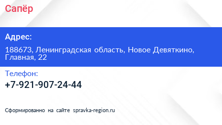 Сапёр по адресу 188673, Ленинградская область, Новое Девяткино, Главная, 22 в дальнейшем Организация, размещена в следующих категориях: