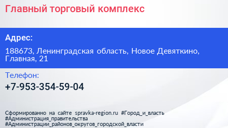 Главный, торговый комплекс по адресу 188673, Ленинградская область, Новое Девяткино, Главная, 21 в дальнейшем Организация, размещена в следующих категориях: