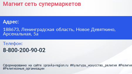 Магнит, сеть супермаркетов по адресу 188673, Ленинградская область, Новое Девяткино, Арсенальная, 5а в дальнейшем Организация, размещена в следующих категориях: