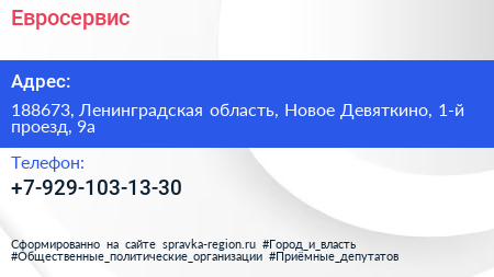 Евросервис по адресу 188673, Ленинградская область, Новое Девяткино, 1-й проезд, 9а в дальнейшем Организация, размещена в следующих категориях: