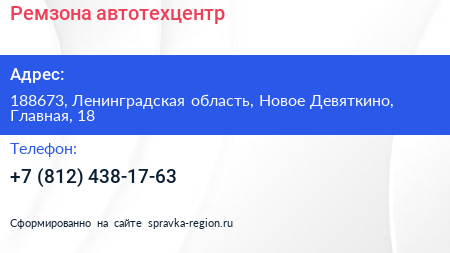 Ремзона, автотехцентр по адресу 188673, Ленинградская область, Новое Девяткино, Главная, 18 в дальнейшем Организация, размещена в следующих категориях: