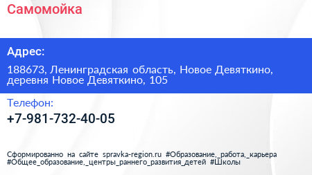 Самомойка по адресу 188673, Ленинградская область, Новое Девяткино, деревня Новое Девяткино, 105 в дальнейшем Организация, размещена в следующих категориях: