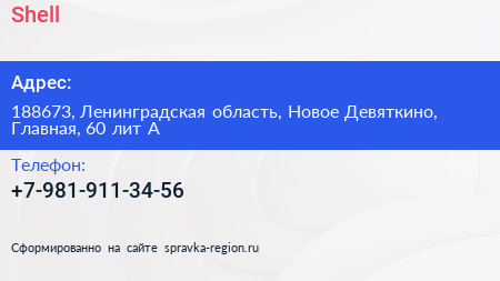Shell по адресу 188673, Ленинградская область, Новое Девяткино, Главная, 60 лит А в дальнейшем Организация, размещена в следующих категориях: