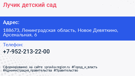 Лучик, детский сад по адресу 188673, Ленинградская область, Новое Девяткино, Арсенальная, 6 в дальнейшем Организация, размещена в следующих категориях: