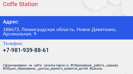 Coffe Station по адресу 188673, Ленинградская область, Новое Девяткино, Арсенальная, 9 в дальнейшем Организация, размещена в следующих категориях:
