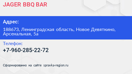 JAGER BBQ BAR по адресу 188673, Ленинградская область, Новое Девяткино, Арсенальная, 5а в дальнейшем Организация, размещена в следующих категориях: